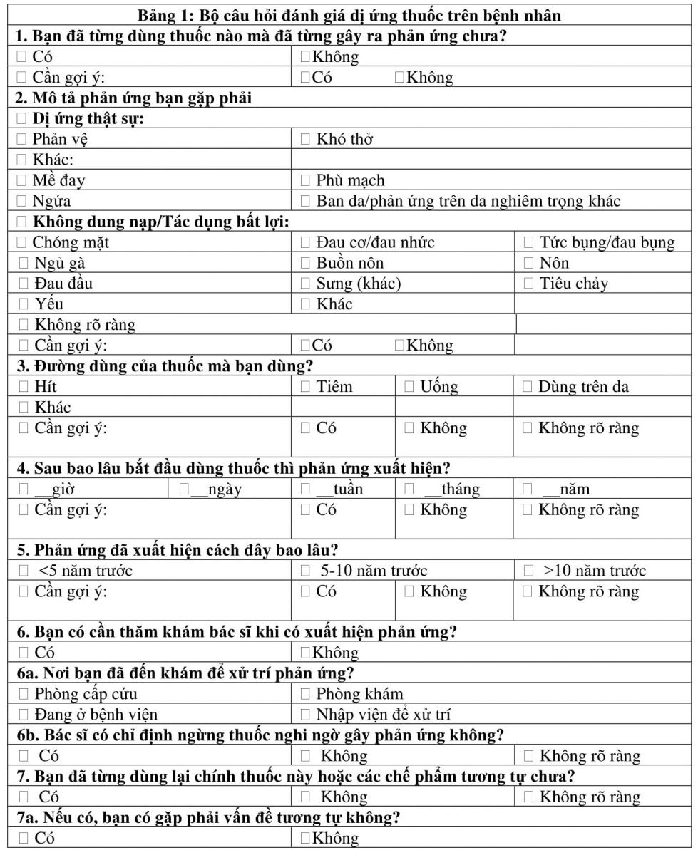 Bảng câu hỏi đánh giá dị ứng thuốc của bệnh nhân